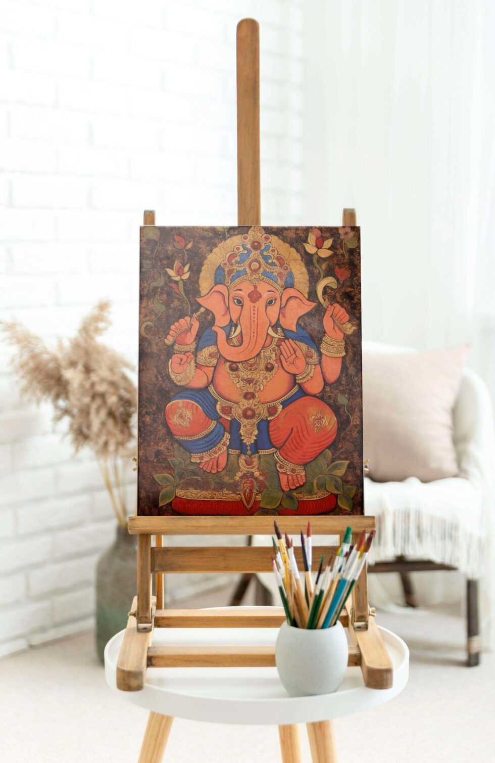 Embrace the aura of spirituality and elegance with this mesmerizing Lord Ganesha painting. Adorned in divine hues and surrounded by mystical shades, this artwork beautifully reflects wisdom, strength, and peace. The intricate detailing of Lord Ganesha’s crown, ornaments, and serene expression makes it a timeless masterpiece. Perfect for enhancing your living room, meditation space, or workplace, this painting radiates positivity, prosperity, and divine protection—bringing harmony and blessings into your home.